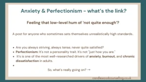 Many people living with perfectionism wait a long time before seeking support — in part because perfectionism makes it difficult to feel that the situation is “bad enough” to justify asking for help. There is often a nagging feeling that the solution lies in ‘just trying harder, managing better, or finally getting things right’.